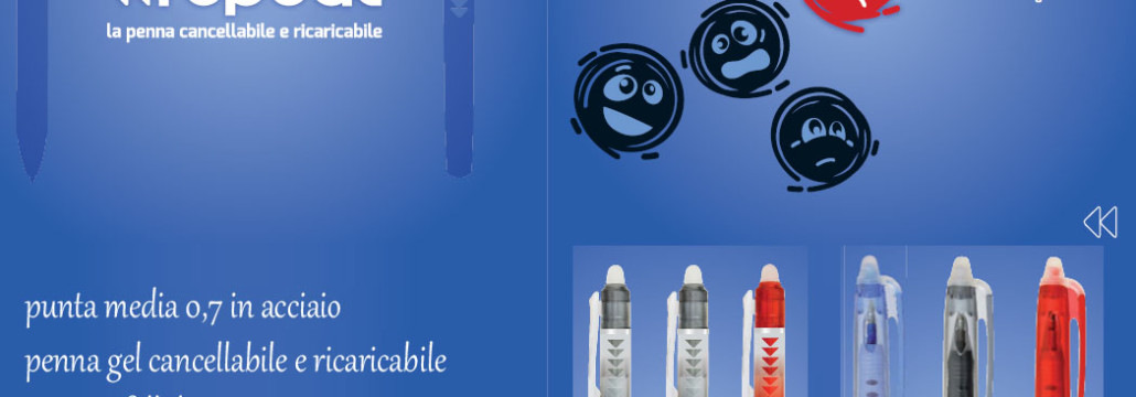 Cancella e riscrivi quante volte vuoi con REPEAT la penna cancellabile e ricaribile , punta media 0,7 mm. in acciaio penna gel cancellabile e ricabile super refill da 0,8 gr. grip gommata, elevato comfort di scrittura, adatta a destrorsi e mancini.